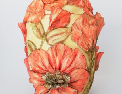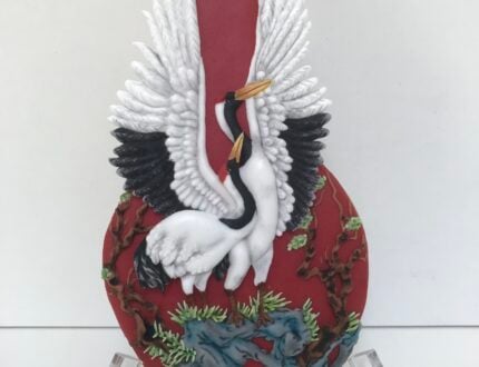I chose my contribution piece from Franz Collection. An ornate red vase with two beautiful bas-relief cranes at the centre. Inspired by nature, Franz’s unique artworks are vibrantly coloured and have three dimensional details and relief. A perfect combination for a beautiful royal iced cookie