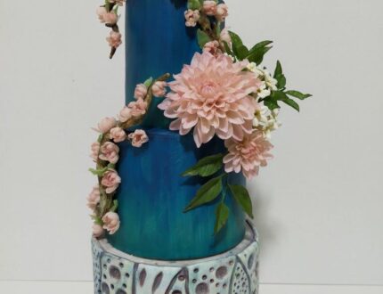 This cake is inspired by a typical Portuguese Pottery work from the north region of Portugal. It is a Portuguese Pottery Holy Water Font Wall Hanging Colourful Vibrant from the region of Coimbra. I tried to recreate this in a cake by hand painting the tile on the cake adding painted ornaments and including some gelatine flowers and rice paper sails in order to identify the transparency of the original painting using edible material