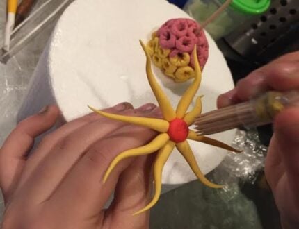 “I truly enjoyed watching the video myself and so did she (5 times). She made an ombré color instead of ivory using modelling chocolate and used Isomalt instead of chocolate for the coral reefs. She hand-modelled the sea creatures—with exception of the sea shells, because she preferred the look of melted chocolate in a mould. She also stylized the Yellow Sea urchins to her liking. She added sponge tubes too and other little things here and there! I truly enjoyed watching her make the the pebbles! What an ingenious way of creating them, I must say!”