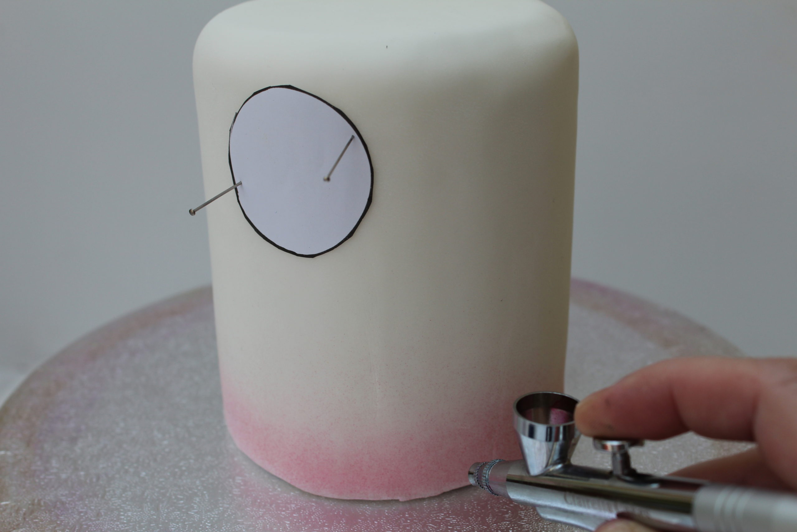 TIP – Be careful how you move airbrushed cakes! Either slide a cake lift underneath the cake or move the board & slide the cake off. Touching must be avoided as you will leave marks on the cake.