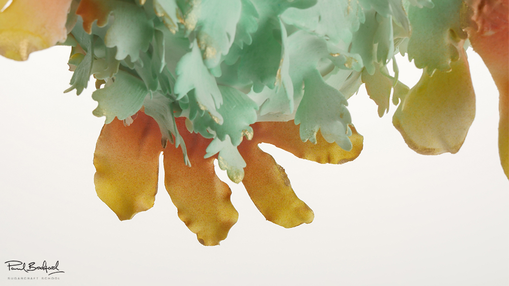 Paul now makes the scales using flower paste. He rolls the paste out very thinly using a pasta roller before slicing them with a flower cutter. He then adds the flowers to the cake using edible glue.