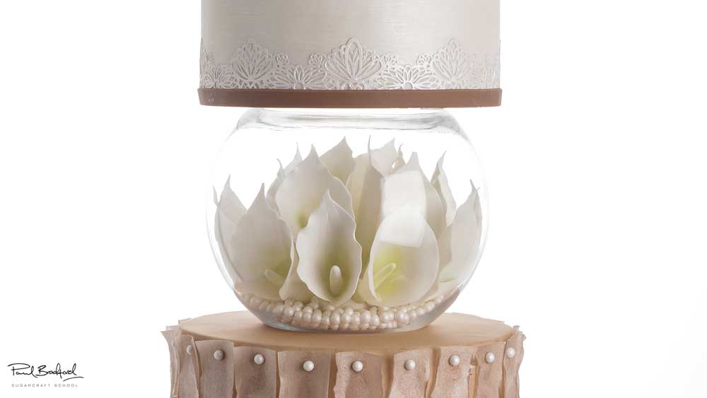 In this lesson, Paul arranges the flowers in the bowl after leaving them to dry overnight. Paul initially uses a ball of brown sugarpaste to hold them in place but later changes it for ivory sugarpaste.