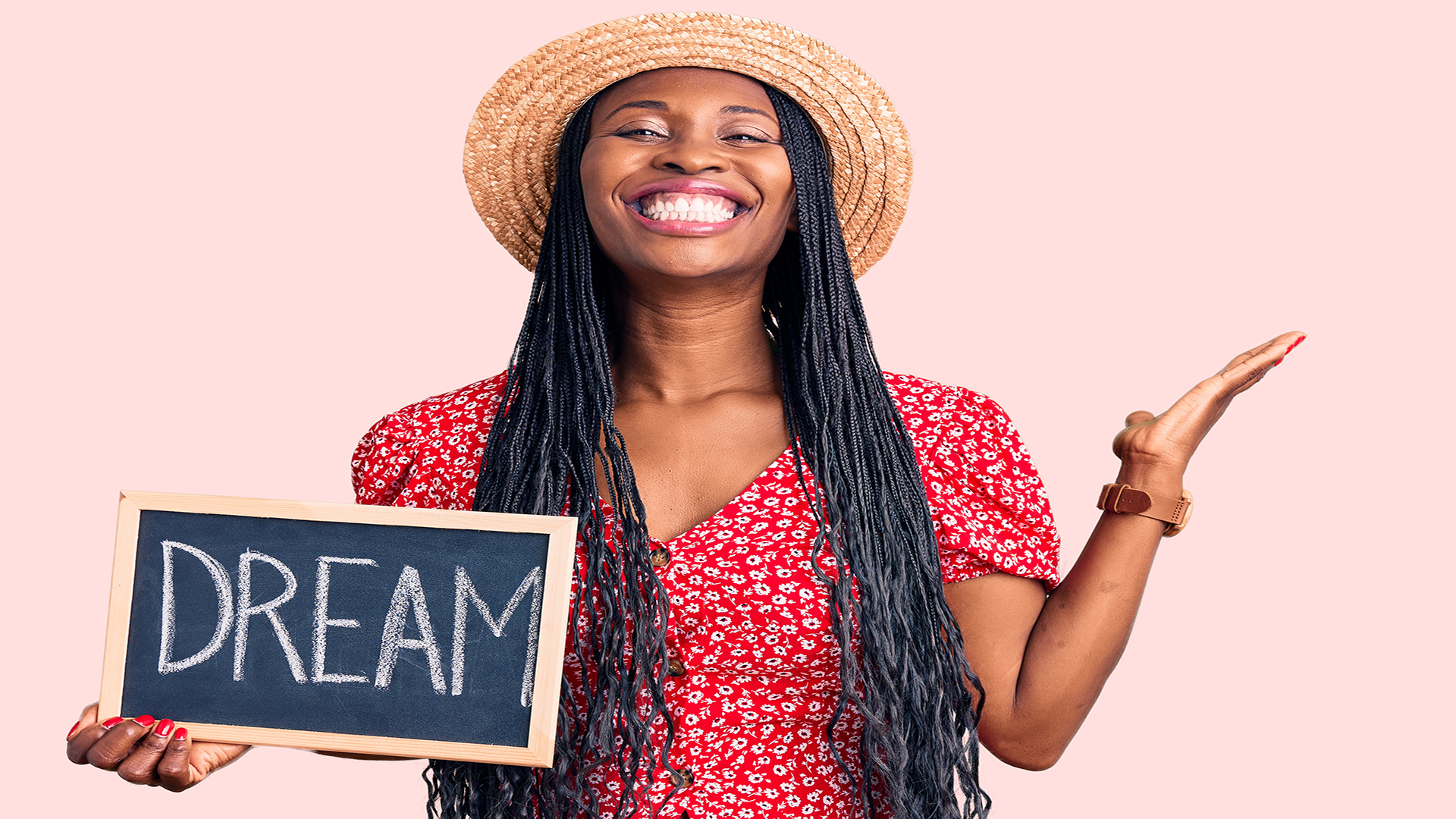 Young,African,American,Woman,Holding,Blackboard,With,Dream,Word,Celebrating