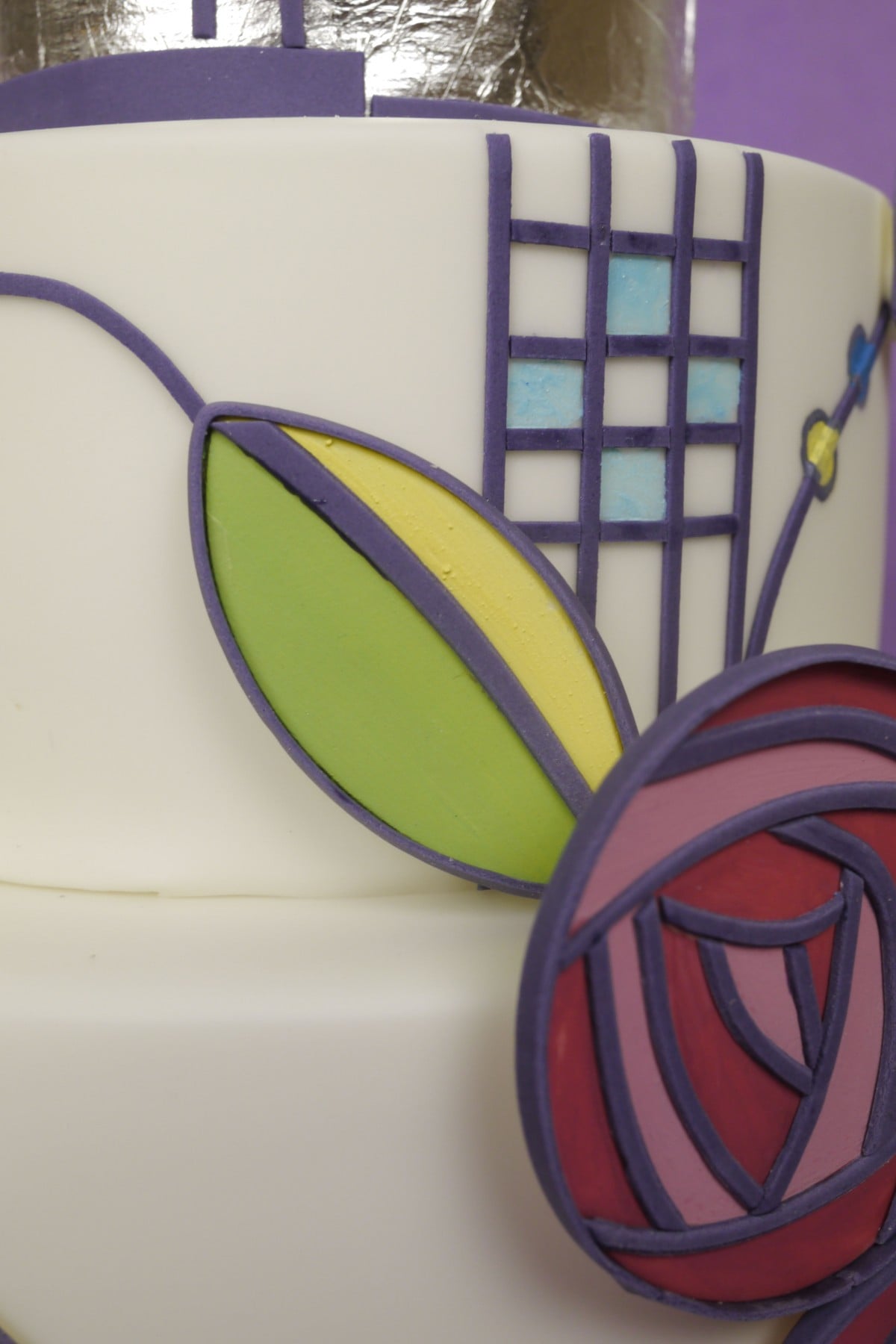 A must for any Charles Rennie Mackintosh and art deco fans out there! This Charles Rennie Mackintosh inspired cake is a great way to learn 2D flowers, painting and silver leaf wrapping techniques. Great for a wedding or anniversary this project is aimed at our intermediate/advanced members and should be made over the space of 2 days to give plenty of preparation time with the decorations.