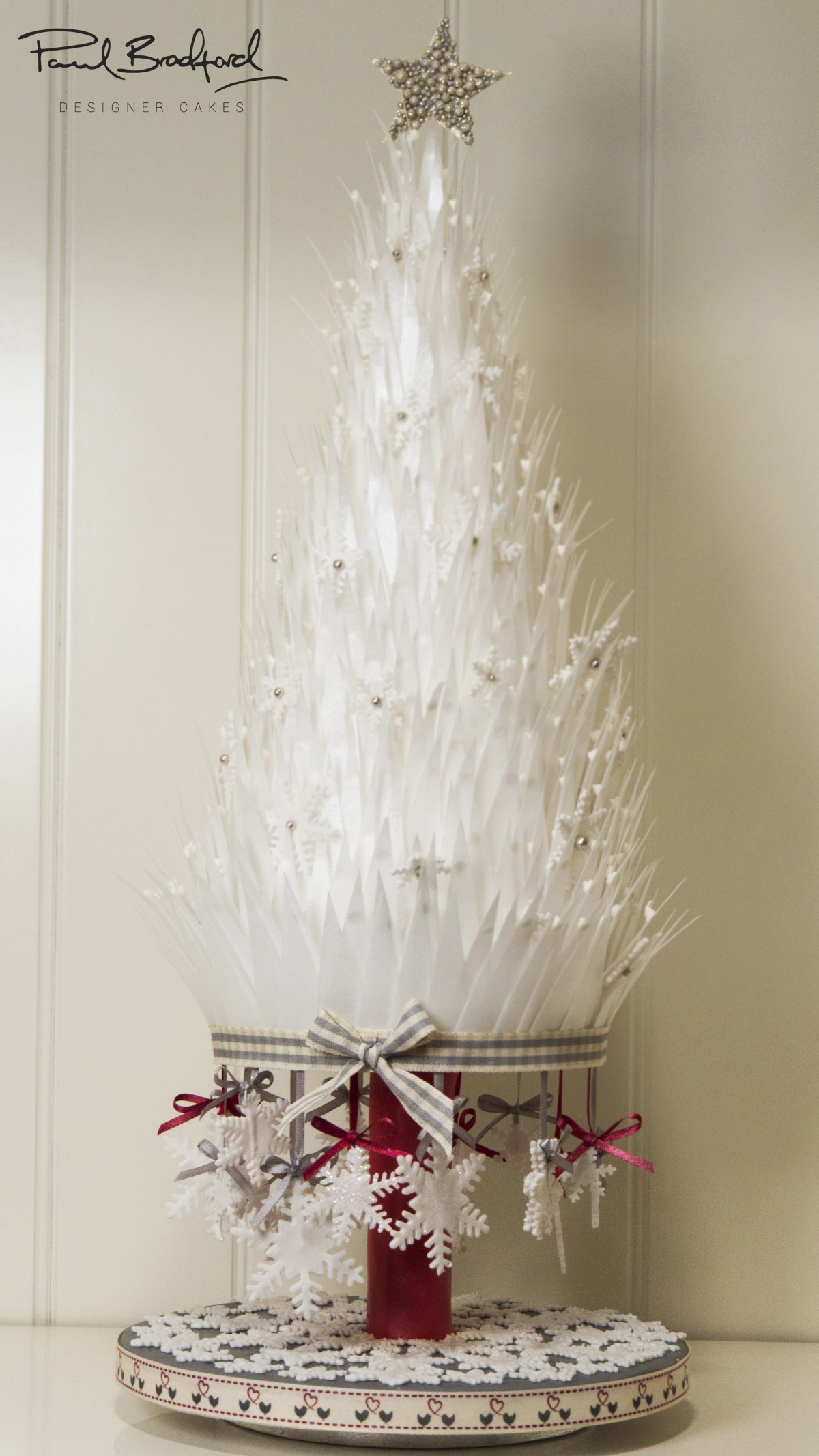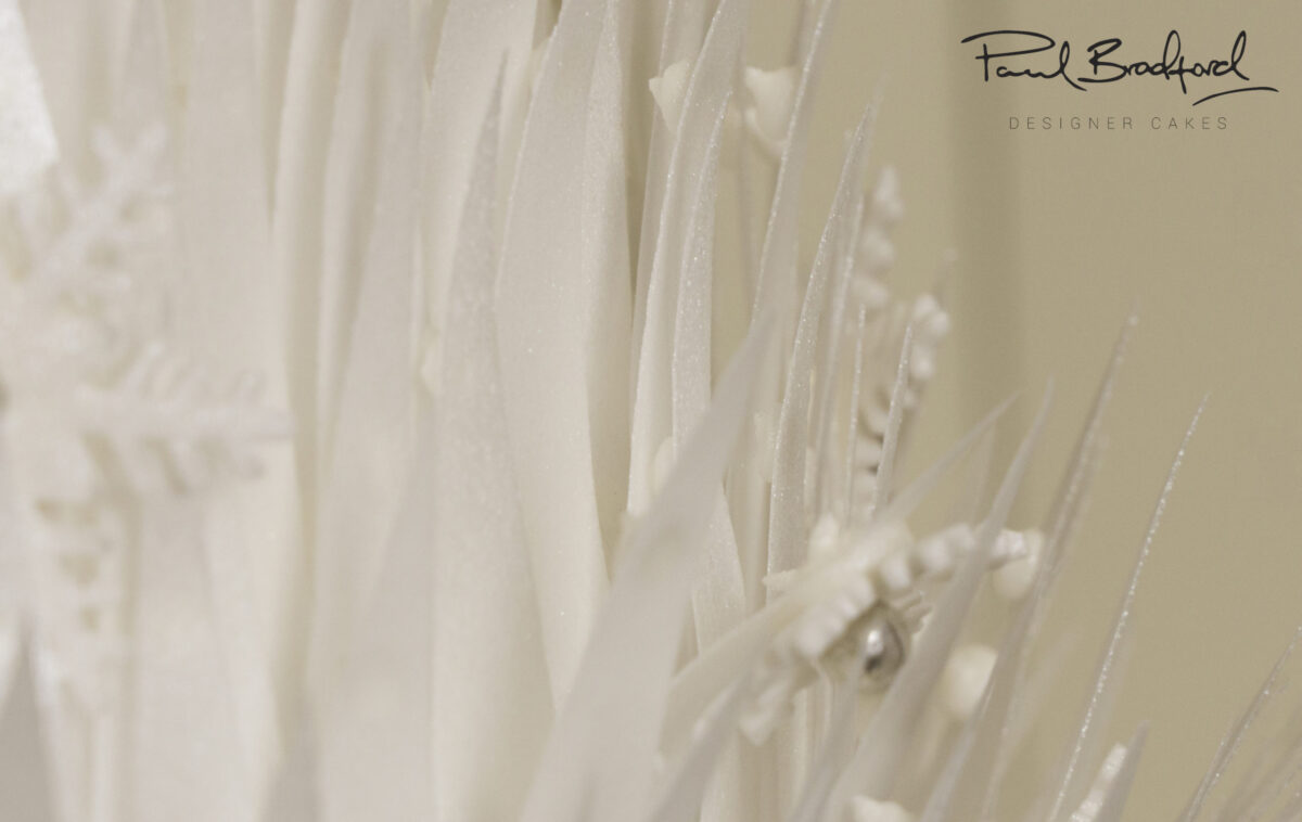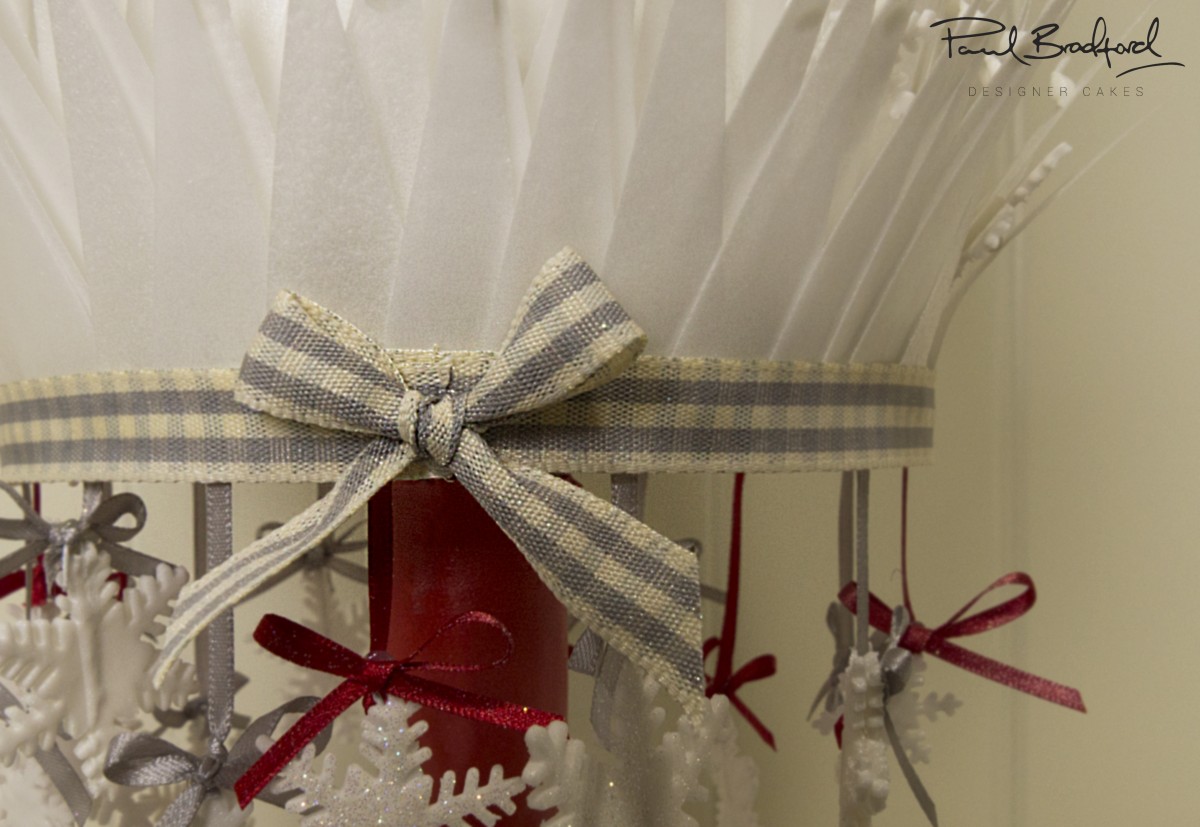 We’re almost there! Ins’t it looking gorgeous? Well of course it is. Remember those cute snow flakes Paul made with the silver balls in the middle? Well now he’s going to start adding them and as well add some other touches that really complete the cake. One word…ribbon.