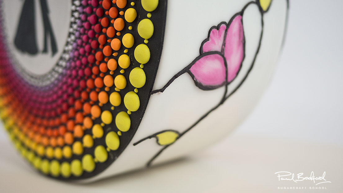 In this lesson she begins adding the beautiful multi coloured piped dots to the plaque. All the colours used to create the various colours of royal icing are listed in the ingredients section below. Remember to only fill the bag with a very little amount, which will give you more control – and although means re-filling more often, is definitely worth it.