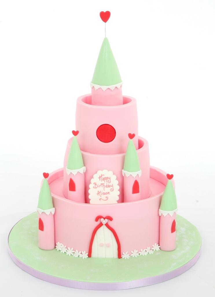 This cake can easily be adapted to become a boys dragon castle just by changing the colours. There’s many additions that can be added i.e. brickwork, giving the rampart effect on the castle, adding models, scene in front of the castle etc.