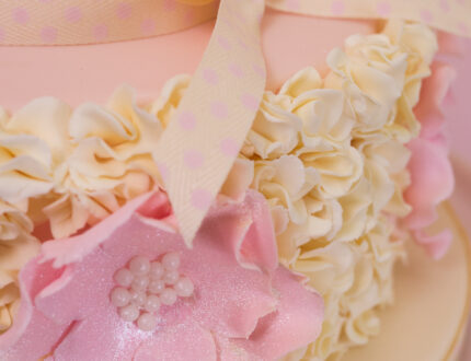 To get the same colour of flower paste as Paul, simply use a 50/50 ratio of pink and white which gives a nice pale pink. When you are rolling it out try and get it to about 1mm thickness or if you have a pasta roller to hand, perhaps use that to make things easier. All you need to do now is cut out three flowers with your cutters and go over the edges with a ball tool to add frills to the petals. Put the three flowers on top of each other with some edible glue and add some pearls to the centre.
