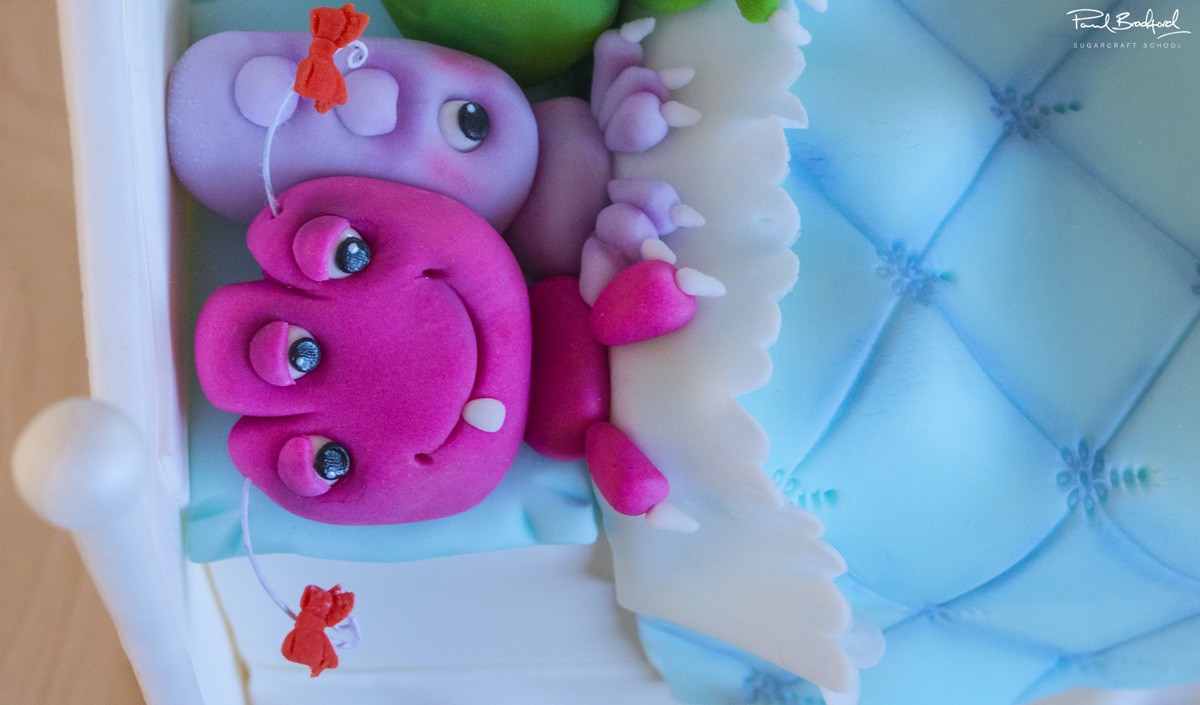 Thinly rolled sausage shaped strips of sugarpaste are added to the headboard and footboard of the bed to finish them off. Glazing the eyes (Brenda uses a confectioners glaze) adds a great shine and realism and using a small ball tool you can add a tiny white dot to each eye ball (as shown) which makes a huge difference for such a small decoration. And with that final detail, the cake is now complete…well done!