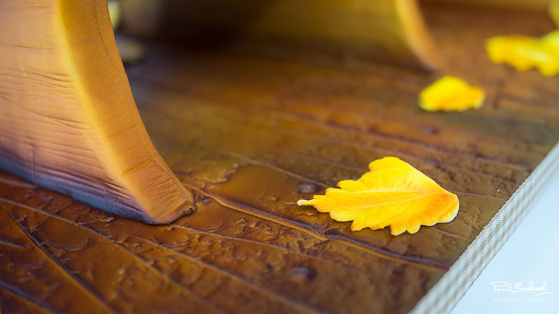 Paul decides to cover the feet before adding them to the board which makes life a lot simpler. Paul covers them in edible glue and then allows them to dry a little before texturing them with PME modelling tools to create a wood effect.