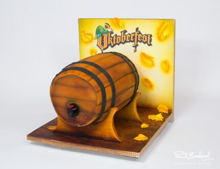 In this lesson, Paul begins to add the wooden panels to the barrel using strips of white sugarpaste textured with a wood grain effect texture mat. The strips are cut at 13” in length and 2” wide, which are then cut to shape on the cake.