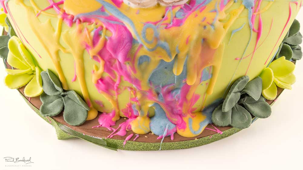 Here we see delicious white chocolate being melted down. Colour dusts are added to create lovely colourful ganache, which is then drizzled over the cake.