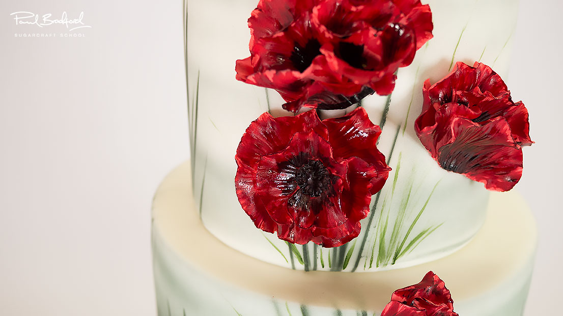 Here Paul adds the poppies to the cake using edible glue and cocktail sticks to allow them to dry securely in position. Paul has already drawn out where he wants them to go which allows him to attach them fairly quickly and confidently. It’s always a good idea to plan these things ahead, so you can work away from the cake first.