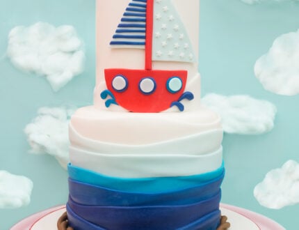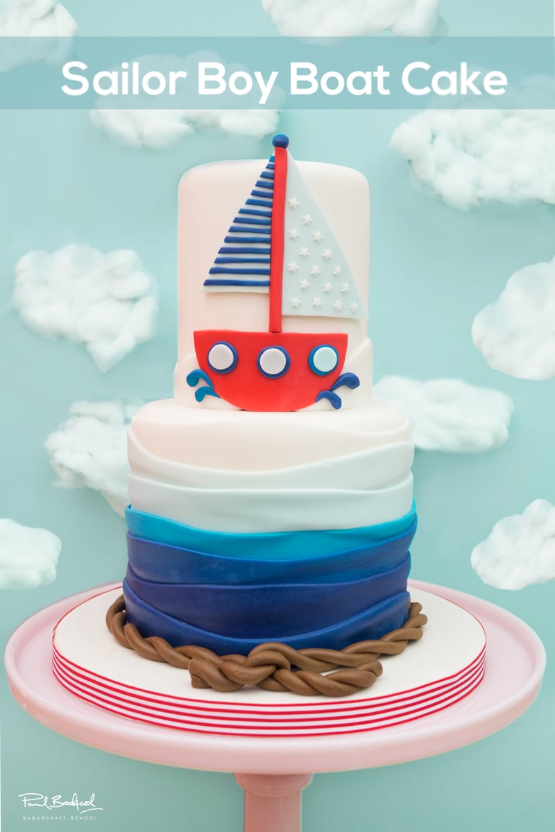 Paul introduces us to his ocean inspired Sailor Boy Boat cake tutorial on CakeFlix. This cake tackles simple carving and stacking techniques, followed by wrapping different shades of sugarpaste to create blue ombre waves on the base tier. Aimed at beginners, this cake will only take a few hours to create and is perfect for a little boy’s birthday or christening.