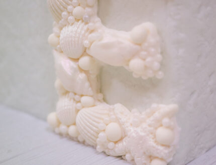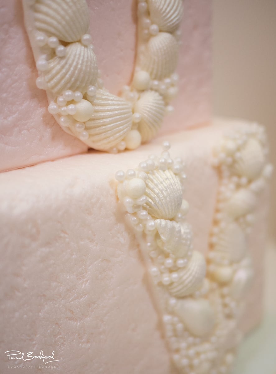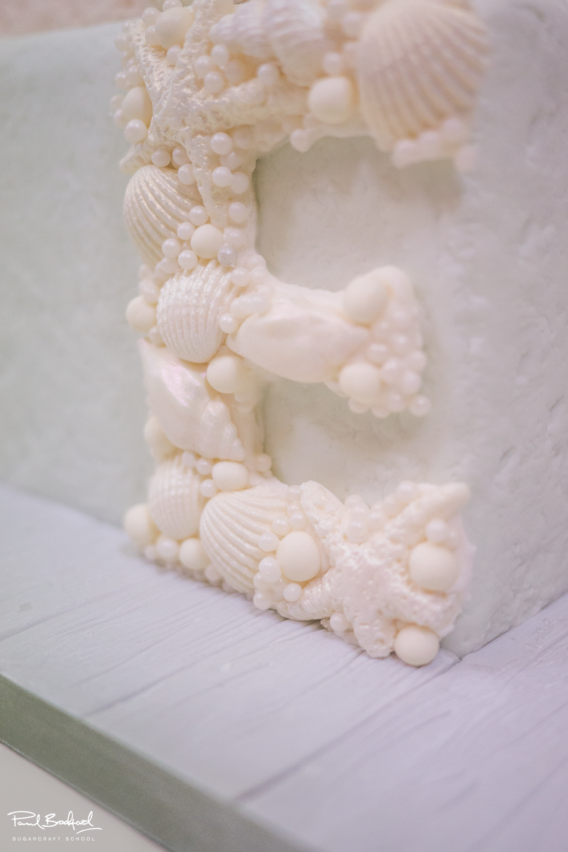 Paul is using some lovely sea shell moulds by Squires Kitchen and his top tip when using them is to brush a little lustre into them before adding the paste which not only makes it much easier to get the paste back out, but also gives it a nice finish. Paul shows us how to use each of the moulds he is using and then adds the shell decorations to the letters by coating them in royal icing and then sticking them on. Just make sure you allow the sea shells to dry before applying them.