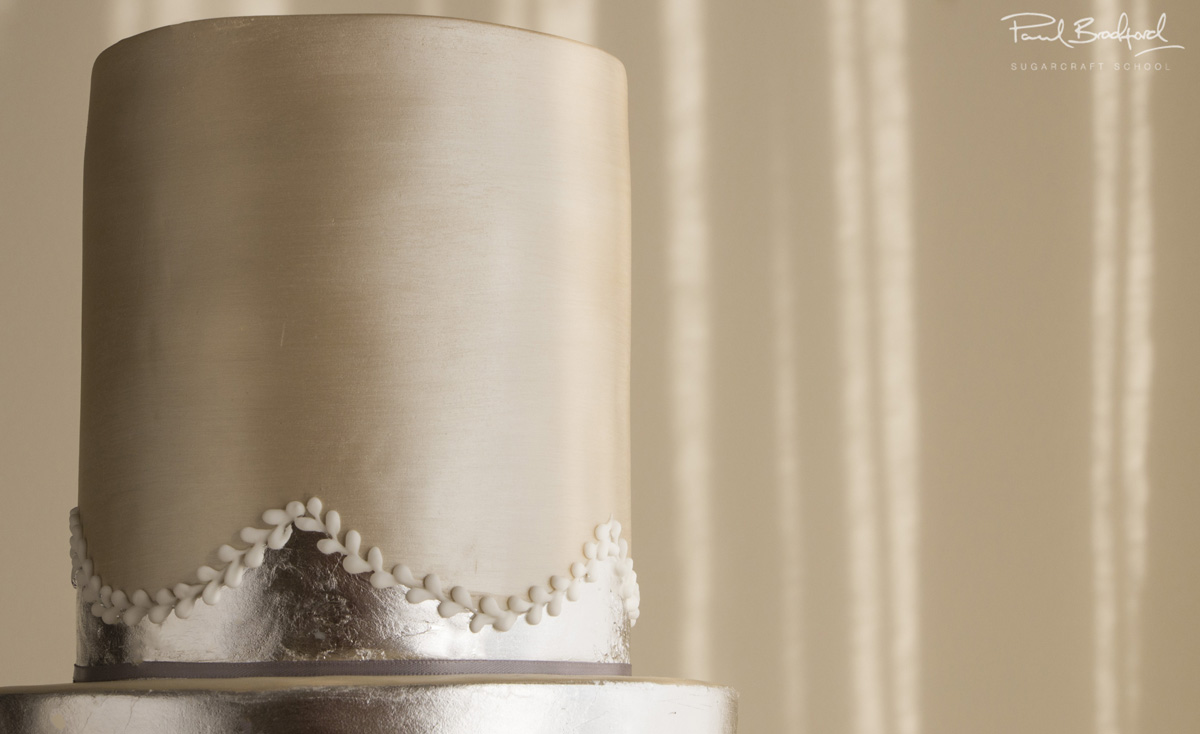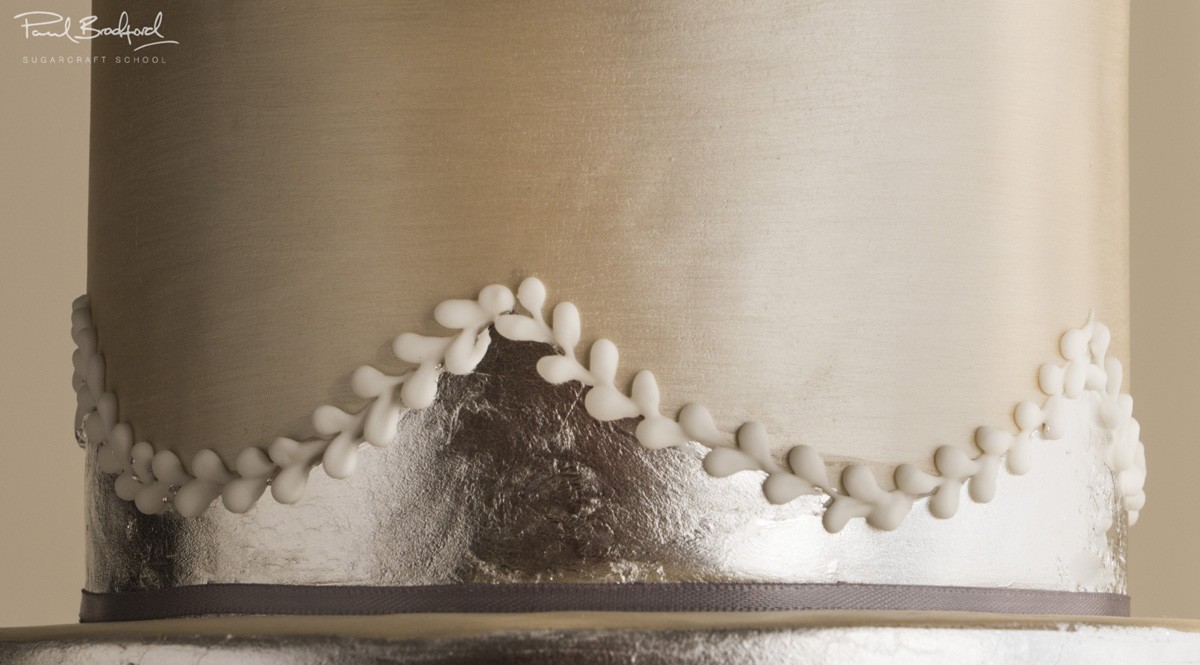 A scalloped effect is produced for the top tier of the cake using silver leaf. Faye uses large lengths of baking parchment with her artwork applied as a tracing guide. You can download the templates here: