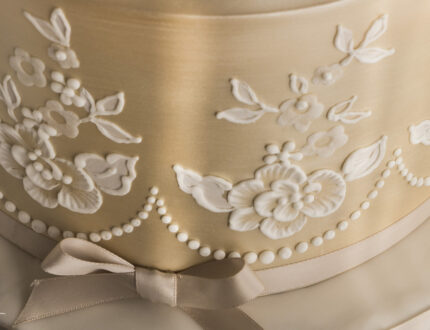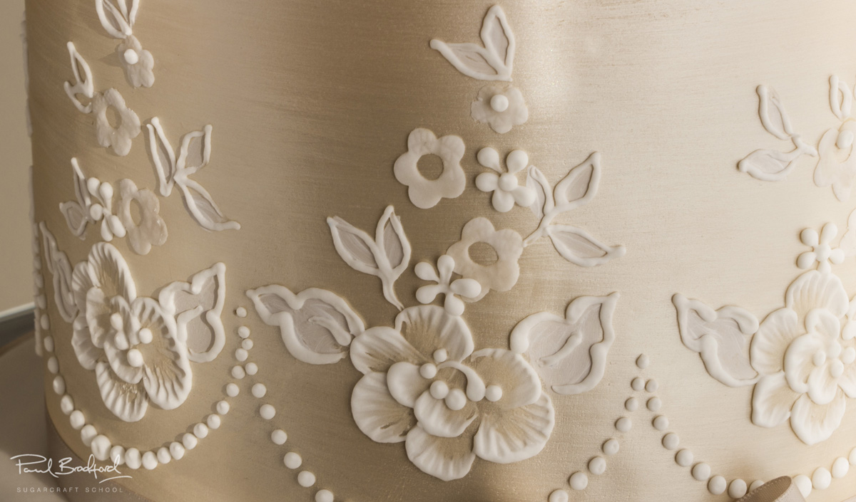 A very special Guest Tutor and super talented cake decorator, Faye Cahill, joins us to teach you how to make this elegant three-tier Simmering Lace Wedding Cake that many brides would dream of having at their wedding. The course includes a huge variety of techniques including lustre, silver leaf, piping, brush embroidery and more. Perfect for intermediate level cake decorators, this cake will take one whole day create.