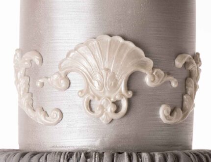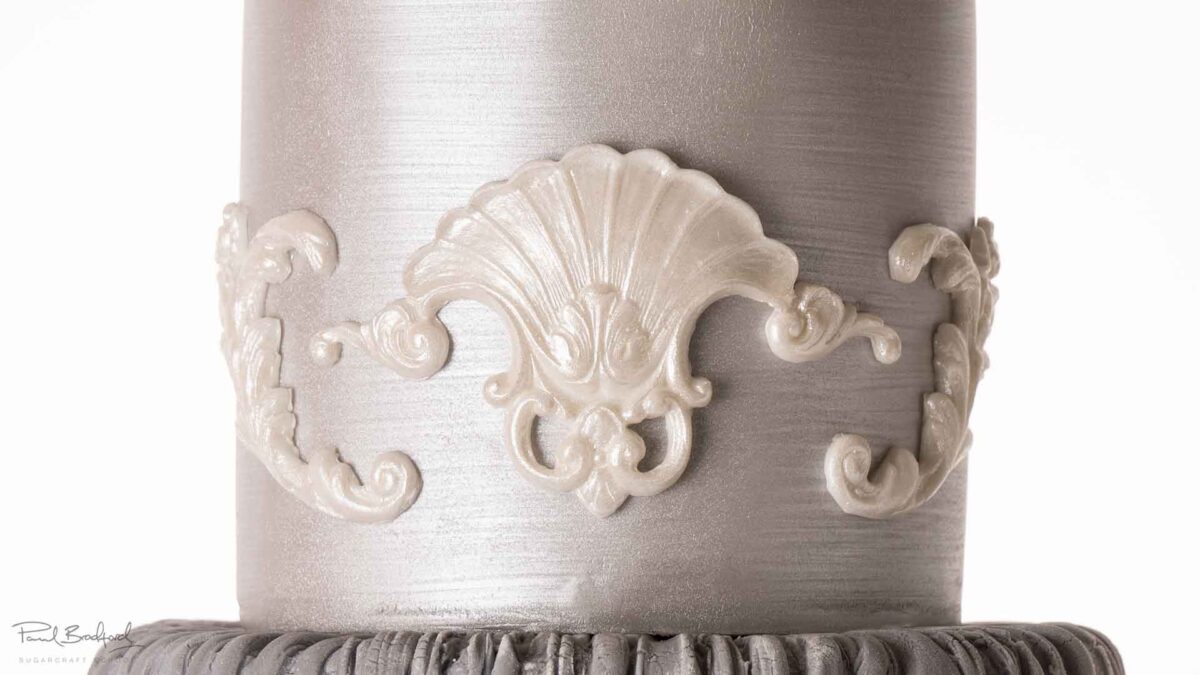 Paul adds the panels of decoration to the bottom tier, and shows us how to seamlessly join them together. He then goes onto decorate the tier above with a lovely wicker mould.