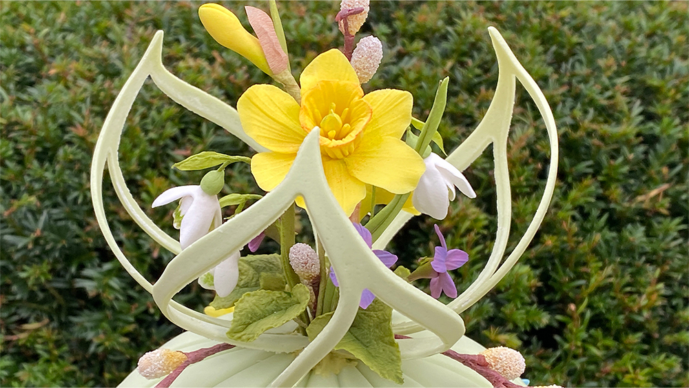 Inspired by the curves of nature in the formation of flowers and rainwater droplets Steve has created this multi skills sugar centerpiece, depicting a Mexican paste teardrop structure encasing, Snowdrops, Pussy willow, Daffodils, Violets, and Leaves. Combining textures created in sugarpaste and Royal icing the innovative scroll link twist design is featured with dropped line string work.