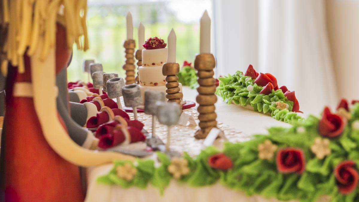 After the creation of the roses, use the pen tool to lift the roses and get them in place on the cake. Use a small paintbrush to open the petals up for more realism. The addition of some gold flowers adds an element of class to the wedding table.
