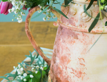 As you can see, the watering can is really starting to take on a vintage feel t but there’s definitely more that can be done to give it more character and Paul has all the tricks up his sleeve to do just this. First of all, Paul paints over it all in a very thin layer of white and dabs it with kitchen roll as well as the end of his brush to add texture. If, like Paul, you would like to add a rust effect simply mix white, orange, brown and red paint little by little until you get a nice rust colour. Dab it on with a large brush and dab any excess away with some kitchen roll. It may look quite frightening at first but as it dries it will look more subtle and realistic.