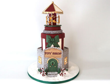 Create your very own whimsical Christmas wonderland with a moving carousel and light up windows. This beautiful cake is sure to bring a smile to any Christmas celebration.